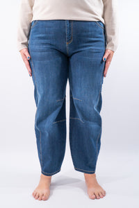 Linea morbida e contemporanea: la gamba arrotondata regala volume sulle cosce e si restringe leggermente al fondo, per un fit confortevole e attuale. Il tessuto denim con comfort stretch accompagna i movimenti, mentre le impunture decorative e le cuciture orizzontali sul davanti donano carattere urbano. Un capo versatile per elevare i look di tutti i giorni.