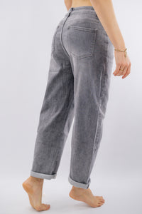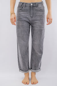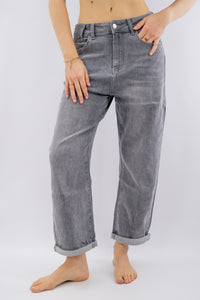 Jeans mom fit lavaggio grigio, caratterizzato dalla vita alta e gamba morbida a partire dai fianchi. Si stringe verso la caviglia e si distingue per la texture leggermente elasticizzata che regala comfort , stile streetwear. La vestibilità è regolare