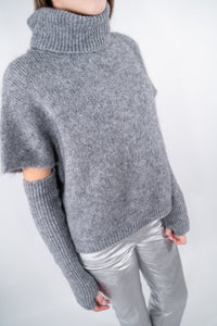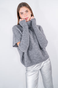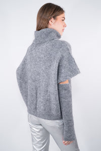Un capo che interpreta la modernità con giochi di volumi e texture. Il morbido dolcevita dalla linea rilassata si combina con manicotti removibili a costa inglese, offrendo un look contemporaneo e accogliente. Perfetta per aggiungere un tocco di stile e comfort all'abbigliamento quotidiano.