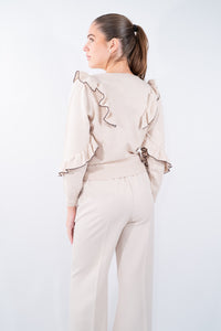 Linee dinamiche e volumi leggeri definiscono questa maglia, dove rouches morbide attraversano il davanti e proseguono sulle maniche per un effetto di movimento raffinato. La costruzione compatta esalta la silhouette, mentre il girocollo pulito rende il capo versatile e facile da abbinare dal giorno alla sera.