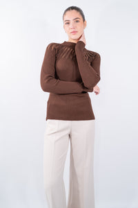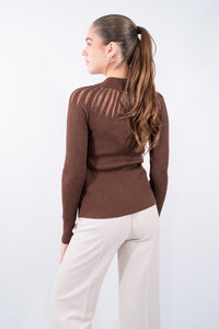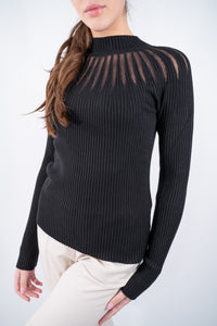 Maglia a lupetto in lana misto viscosa. La lavorazione a costine abbraccia la silhouette con comfort elastico, mentre l’inserto trasparente sul carré disegna un motivo grafico dal delicato effetto vedo‑non‑vedo. Un capo versatile, ideale da indossare da solo o in layering per aggiungere un tocco contemporaneo a ogni look.