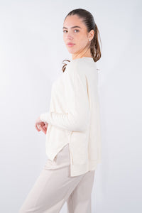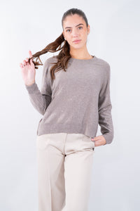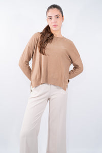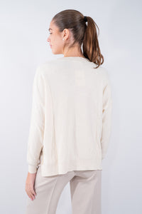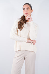 Maglia scatoletta esalta la silhouette con una costruzione leggermente più corta davanti e lunetta posteriore allungata. Il filato percorso da delicate micro pailettes diffonde una luce discreta, mentre i spacchi laterali donano movimento e un fascino contemporaneo al capo.