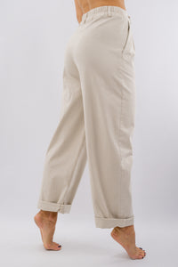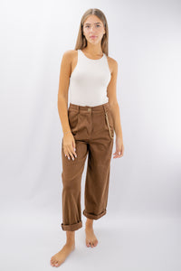 Pantalone a vita alta simil ovetto realizzato in cotone ed elastan. Presenta tasche alla francese ed elastico posteriore in vita per il massimo comfort. Le pinces valorizzano il capo mentre il tessuto leggermente stretch assicura libertà di movimento durante tutta la giornata. La catena applicata dona contemporaneità e lucentezza al capo, perfetto per look versatili e casual. Vestibilità regular con varietà di taglie.