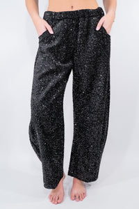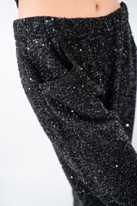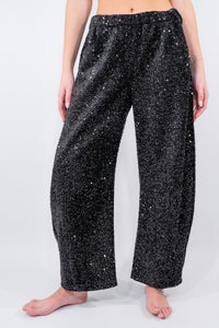 Pantalone baloon realizzato con pailletes. Un capo dal design audace che cattura la luce ad ogni movimento. La silhouette morbida garantisce comfort senza rinunciare all'eleganza. Realizzato con tasche sul davanti e morbido elastico in vita. Perfetto abbinato al top corrispondente per outfit serali o per donare un tocco di brillantezza ai look quotidiani. Vestibilità morbida con varietà di taglie.